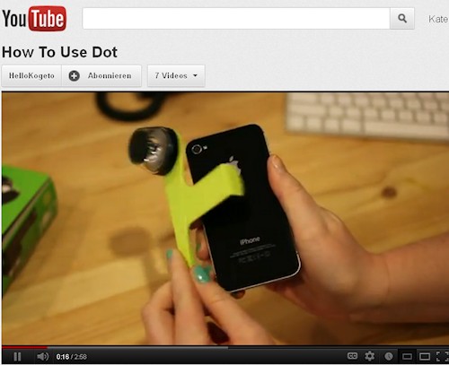 Kogeto’s Dot ist ein Zubehör für die Kameralinse des iPhones und benötigt keinerlei zusätzliche Akku-Unterstützung oder Speicherkapazität. Einfach auf die Linse aufklipsen, Kogeto´s Looker App herunterladen, Linse über das Display kalibriert und es geht los. Schnell ist der erste eigene Film zwar nicht im «Kasten» sondern im iPhone abgelegt und kann angeschaut oder bei Facebook und Co. gepostet werden. Die Videos, die sogenannten «dotspots» können auf die Video-Sharing Plattform von Kogeto gestellt werden und sind dort einer weltweiten Community zugänglich. Die dotspots sind keine Aufeinanderfolge von Einzelbildern, sondern es wird ein digitales 360 Grad Video erzeugt, das man in bekannter iPhone Manier hin und her bewegen kann. Hier einige Beispiele (anklicken):
