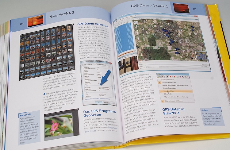 Bildbearbeitung / Nikon Transfer / Die Optionen / Voreinstellungen / Menüoptionen / Die Übertragung starten / ViewNX 2 / Der Arbeitsbereich / Analyse / Die Kameraeinstellungen / Ansichten ändern / GPS-Daten auswerten / Das GPS-Programm GeoSetter / GPS-Daten in ViewNX 2 / Fotos strukturieren / Vollbild-Ansicht / Zusätzliche Optionen