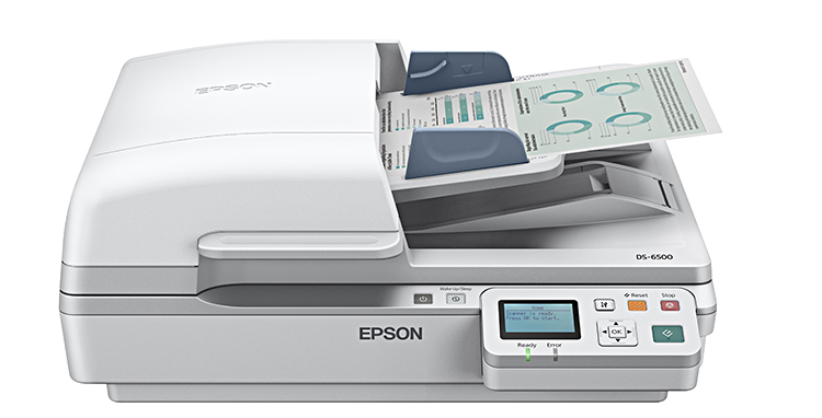 Auch die Epson WorkForce DS-6er Serie erlaubt den parallelen, doppelseitigen Scan von Dokumenten und ist optional mit einem Netzwerkmodul aufrüstbar. Alternativ zur Nachrüstung sind die netzwerkfähigen Modelle WorkForce DS-60000N und DS-6500N verfügbar.