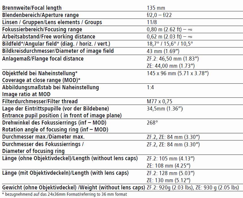 Das Apo Sonnar T* 2/135 verfügt über ein Ganzmetallgehäuse, das einen langjährigen Einsatz mit Ergebnissen höchster Qualität ermöglicht. Es wird mit manuellem F-Bajonett (ZF.2 für Nikon) und mit EF-Bajonett (ZE für Canon) verfügbar sein.