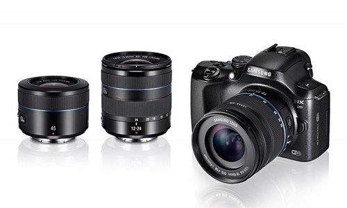 Samsung NX20 mit aufgesetztem 18-55mm sowie den beiden neuen Objektiven 12-24mm und 45mm.