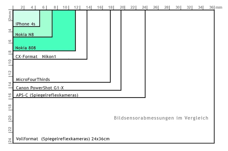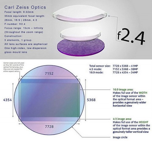Auf Grund der Angaben von Nokia besitzt die Kamera folgende Eigenschaften: Der Bildsensor liefert eine Gesamtauflösung von 41 Millionen Pixel. Wählt der Fotograf ein Seitenverhältnis von 3:4, so stehen 38 Mpx für die Fotos zur Verfügung. Bei einem Seitenverhältnis von 16:9 sind es 34 Mpx. Um die riesige Zahl an Pixeln unterzubringen, war es notwendig, einen Bildsensor mit grossen Abmessungen zu entwickeln. Der Aufnahmechip hat in etwa die Grösse von 11×7 mm. Das entspricht fast den Abmessungen eines CX Sensors (13.6 x 8,8 mm), der momentan in den Nikon 1 Systemkameras und in der Sony Kompaktkamera Cyber-shot DSC-RX100 zu finden ist. Allerdings besitzt der Nokia Chip eine doppelte bis vierfach höhere Auflösung.