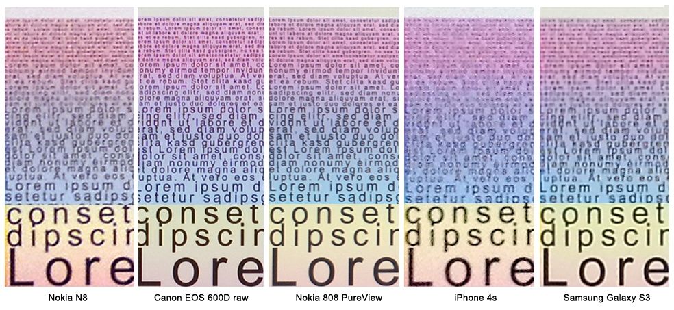 Damit die Unterschiede deutlich werden, war es notwendig, einen sehr kleinen Ausschnitt aus den Testtafel-Fotos zu schneiden und diese zu kombinieren. Natürlich liefern auch die anderen Testkandidaten im täglichen Gebrauch gute Resultate. Testaufnahmen zeigen zwar, in etwa, was von einem Gerät zu erwarten ist. Je nach Aufnahmesituation können sich die Ergebnisse aber deutlich voneinander unterscheiden. Wo der eine Fotoapparat schwachen zeigt, punktet die andere Kamera, oder umgekehrt. Das Nokia 808 macht, wie jedes andere Smartphone, auch Videoaufnahmen. Weil ich mich aber mit diesem Thema nur selten befasse, habe ich diese Funktion nicht bewertet.