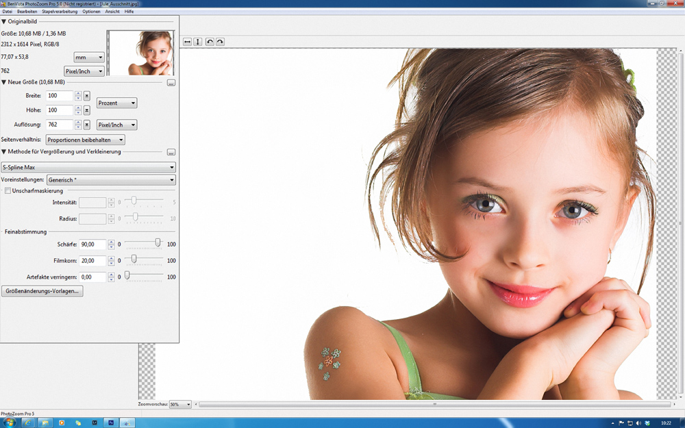 PhotoZoom Pro 5 ist funktional auf die Erhaltung höchstmöglicher Qualität der Bilder ausgelegt, die beim Skalieren für Poster, Fineart-Print, der Rekonstruktion alter Bilder mit geringer Auflösung und für die druckfähige Auflösung von Mobile-Imaging (Smartphone- und Handy-Fotos) notwendig sind. Auch digitale Bilder der ersten Generation und gescannte alte Fotografien erleben so ihren qualitativen Neuanfang.
