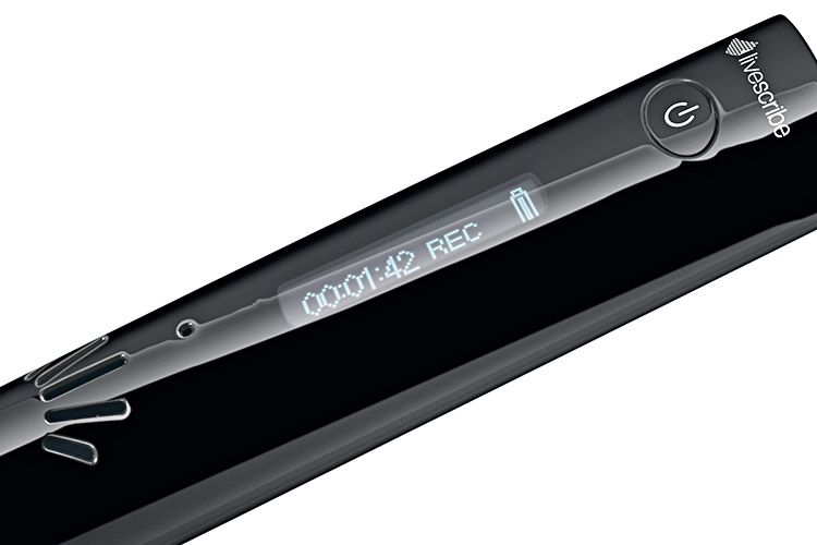 Smartpen mit integriertem Audiorecorder und Mikrofon (Schlitze links im Bild).