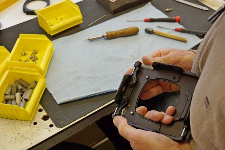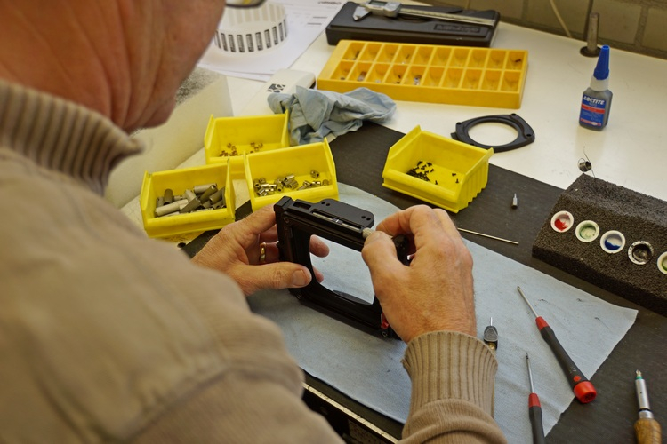 Nicht nur in der Teilefertigung regiert der tausendstel Millimeter, sondern ebenso in der Montage. Wer sich hier ein Fliessband vorstellt, an dem fleissige Bienen sitzen, der irrt. Bei Cambo ist alles akribische Handarbeit, und die Leute, die hier arbeiten, sind Spezialisten, die schon jahrelang bei Cambo arbeiten und jedes Produkt in- und auswendig kennen. Kommt hinzu, dass bei Cambo in Jobrotation gearbeitet wird. «Jeder muss bei uns alles können» sagt van Benthem, «fast alles. Natürlich gibt es Spezialisten in der Konstruktion und administratives Personal. Aber im Produktionsbereich finden Sie die gleichen Leute einmal am Bearbeitungsautomaten und kurz danach in der Kameramontage. Damit bleibt die Arbeit interessant, es entsteht keine Monotonie, und das wirkt sich positiv auf die Qualität der Produkte aus.»