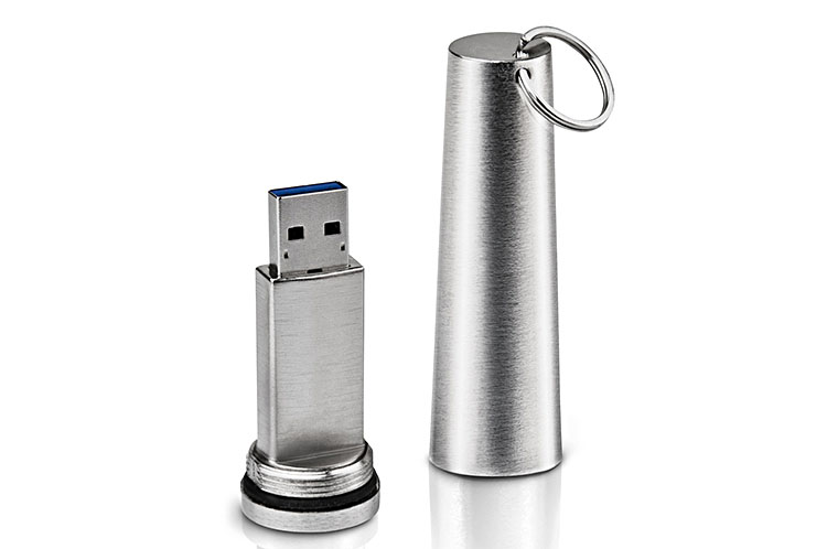 Der LaCie XtremKey hat schein in seiner ersten Version mit USB 2.0 für sein extrem robustes Design mehrere Auszeichnungen erhalten. Sein starkes Metallgehäuse (74 x 22 mm, 57 g) besitzt ein verschleissfreies Schraubgewinde mit einem O-Ring aus Gummi. Dadurch ist der LaCie XtremKey wasserdicht und zwar bis zu einer Tiefe von 200 Metern.