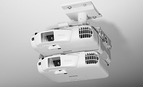 Das Epson EB-W16SK Projektionssystem besteht aus zwei EB-W16 Projektoren, die in einer speziellen, mitgelieferten Halterung fest miteinander verbunden sind. Die Geräte werden über einen HDMI-Splitter angesteuert und sind untereinander mit einem USB-Kabel verbunden.