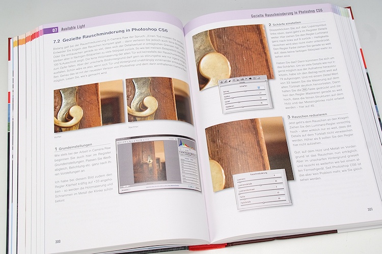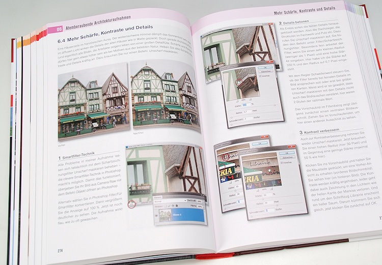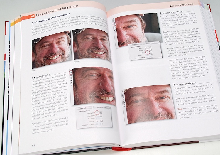 Soviel zum Konzept. Martin Vieten, ein Photoshopper der ersten Stunde, hat genau diesen Workshop «Photoshop für Fotografen» als Dauerbrenner in seinem Kursprogramm, und so ist der Stoff auch laufend gewachsen und den echten Bedürfnissen der Workshop-Teilnehmer angepasst worden. Dabei geht der Autor sehr geschickt vor und behandelt in jedem Motivbereich zunächst das Generelle und geht danach auf verfeinerte Techniken ein, um noch bessere Effekte und Korrekturen zu erzielen. Und gerade in diesen Verfeinerungen finden selbst erfahrene Photoshop-Hasen noch wertvolle Tipps, wie man bestimmte noch besser und vielleicht einfacher lösen kann. Oder man entdeckt plötzlich Möglichkeiten und Techniken, die einem gar nicht bewusst waren. Hinzu kommen, die aufschlussreichen Ergebnisbilder mit den passenden Menüpunkten, welche didaktisch geschickt durch jede Aufgabe führen. Etwas schade, dass dabei in vielen Fällen das Endergebnis nicht mehr gezeigt wird, und dass die Originaldateien – oder mindesten die wichtigsten davon – zum Nachbearbeiten nicht als Download zur Verfügung stehen.