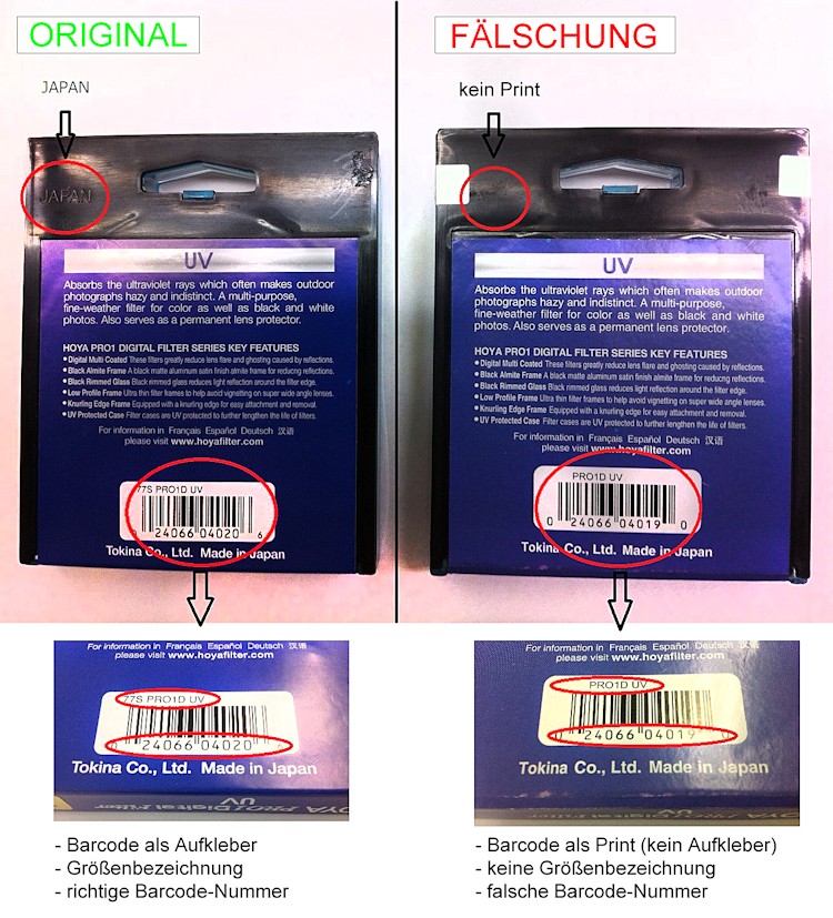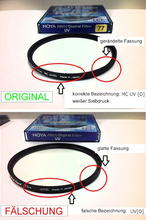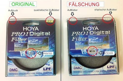 Hoya-Filter gelten als Premiumprodukt innerhalb dieser Zubehörkategorie, steckt welches mit einem grossen Aufwand in Forschung, Entwicklung und Produktionstechnik hergestellt wird. Nun versuchen Plagiateure vom ausgezeichneten Markenimage zu profitieren wollen und unter dem geschützten Namen Hoya billige Fälschungen in Verkehr bringen.
