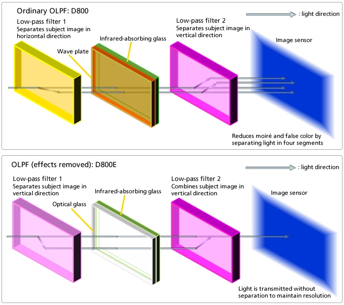 «Ohne Tiefpassfilter» bedeutet nicht, dass der Sensor nackt bzw. ungeschützt ist. Wie die zweite Grafik (die über die Nikon D800/D800E) zeigt, wird der Filter nicht einfach ersatzlos entfernt. Vor dem Sensor befindet sich ein Fiterpaket aus mehreren Filterschichten mit verschiedenen Aufgaben.