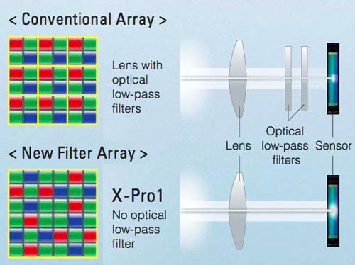 Bei Kameras mit herkömmlichen Sensoren mit Bayer-Farbfilteranordnung besteht das Problem, dass die regelmässige Struktur des Sensors mit der des aufgenommenen Motivs aufeinandertrifft. Das dabei entstehende Moiré sowie andere Artefakte wurden bisher durch ein Tiefpassfilter vor dem Sensor reduziert. Darunter leiden allerdings Auflösung und Schärfe der Bilder. Deshalb kommen immer mehr Kameras auf den Markt, die entweder durch ihre spezielle Pixel- und Farbfilteranordnung ein optisches Tiefpassfilter überflüssig machen oder bewusst für Spezialanwendungen, die allerhöchste Detailwiedergabe verlangen, auf ihn verzichten.