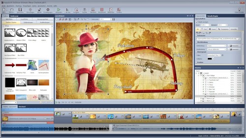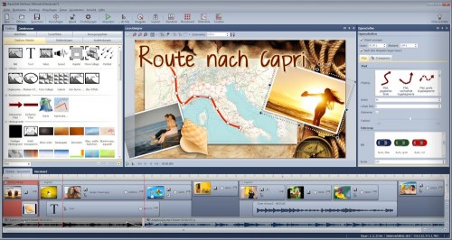 • Karten und animierte Reiserouten: Live, ohne den Umweg der Videoerstellung, abspielbar, mit globalem Material (von OpenStreetMap) mit hoher Detaildichte und vier Kartenstilen und über 30 Routenarten mit beweglichen Pfeilen, Verkehrswegen, Reifenspuren, Fährten und dekorativen Elementen. Autos, Flugzeuge oder eigene Transportmittel lassen sich animieren. Auch eigenes Kartenmaterial ist einsetzbar.