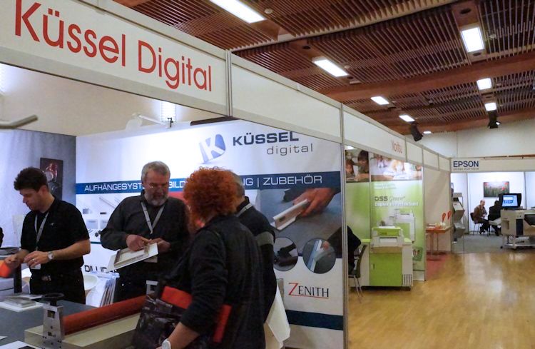 Viele der Stände sind sehr uniform gestaltet. Im Vordergrund die Firma Küssel die auf Bildaufhängesysteme spezialisiert ist.