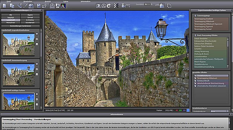 Maximaler Gestaltungsspielraum durch sieben neu entwickelte HDR-Algorithmen. HDR projects platin bietet Ihnen nie dagewesene Möglichkeiten, direkt in den HDR-Prozess einzugreifen. Sie bestimmen in der HDR-Erzeugung Parameter wie Glättung, Entrauschung, Halo-Anpassung und mehr.