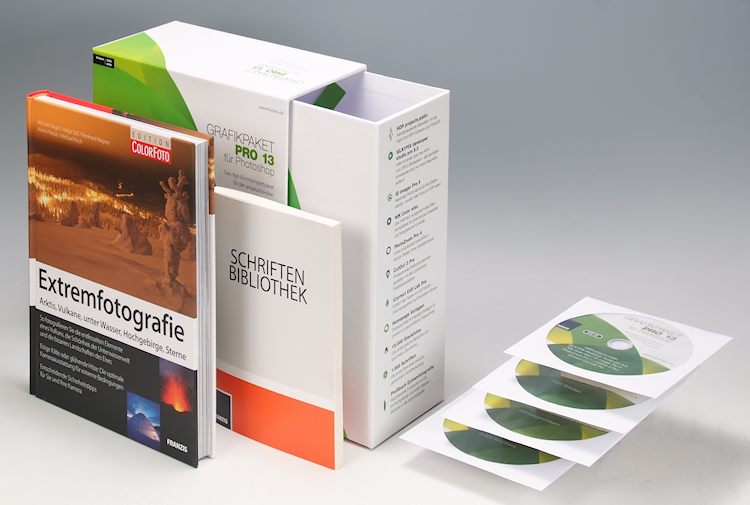 Franzis bietet in ihrem Grafikpaket Pro 13 sieben interessante Programme, die man rund um den Photoshop, oder auch zu anderen Bildbearbeitungsprogrammen, sinnvoll und effizient nutzen kann. Dazu gibt es auf CDs und DVDs 1’900 Schriften, 15’000 lizenzfreie Stockfotos, eine Sammlung von fertigen Webdesign-Vorlagen, sowie ein faszinierendes Buch über Extremfotografie.