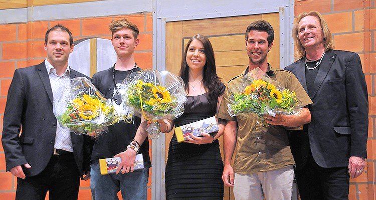 Zwischen Alain Roulier und Rolf Sutter die Notenbesten: Clemens Stucki, Olivia-Silena Zaugg und Sandro Pollinger, der zusätzlich noch für das beste Arbeitsbuch geehrt wurde
