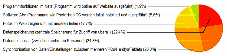 Die Befürworter der Cloud-Dienste nutzen diese vor allem zur Synchronisation von Daten und Einstellungen zwischen mehreren PCs/Handys/Tablets (28,0%), zum Datenaustausch zwischen mehreren Personen (24,3%), zur Datenspeicherung, damit sie von überall darauf zugreifen können (22,4%), um Fotos im Web zu zeigen und mit anderen teilen (17,7%) – was uns etwas überraschte, denn wir hatten diesen Anteil höher erwartet – und 5,6% nutzen bereits mit Software-Abos oder 1,9% Programmfunktionen im Netz.