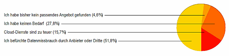 Die Gegner von Cloud-Lösungen befürchten zu 51,8% einen Datenmissbrauch durch Anbieter oder Dritte (PRISM lässt grüssen), 27,8% haben keinen Bedarf, 15,7% empfinden die Lösungen als zu teuer und 4,6% haben bisher kein passendes Angebot gefunden.