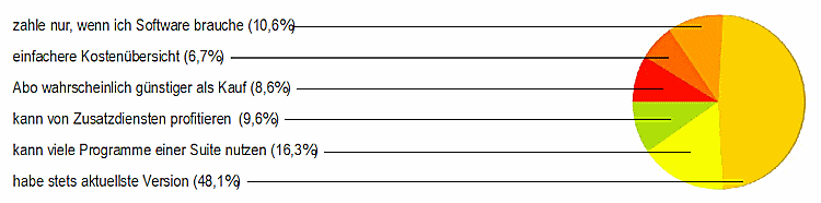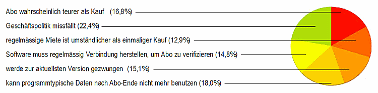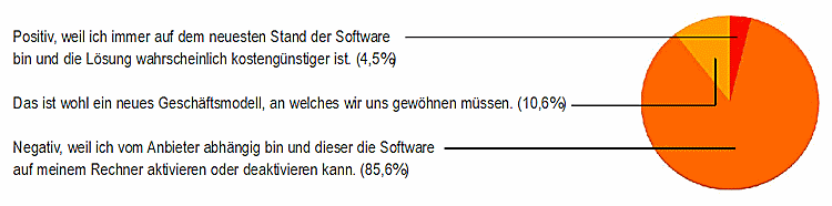 Die Kernfrage, wie unsere Leser die Lizensierung von Software im Abonnement beurteilen, zeigte folgendes eindeutiges Bild: 85,6% sind gegen diese Lösung, weil sie vom Anbieter abhängig sind und ihnen missfällt, dass der Anbieter die Software auf dem Rechner aktivieren oder deaktivieren kann. 10,6% sehen darin ein neues Geschäftsmodell, an welches wir uns wohl gewöhnen müssen, und nur gerademal 4,5% stehen dem neuen Angebot positiv gegenüber, weil sie immer auf dem neuesten Stand der Software sind und sie die Lösung als kostengünstiger erachten.