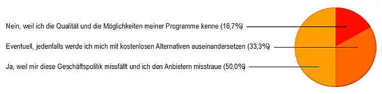 50% haben mit einem deutlichen Ja geantwortet, weil ihnen diese Geschäftspolitik missfällt und sie den Anbietern misstrauen. Exakt ein Drittel will nun vor allem kostenlose Alternativen prüfen, und nur 16,7% werden nicht auf eine andere Software umsteigen, weil sie die Qualität und die Möglichkeiten ihrer Programme kennen und diese auch schätzen.