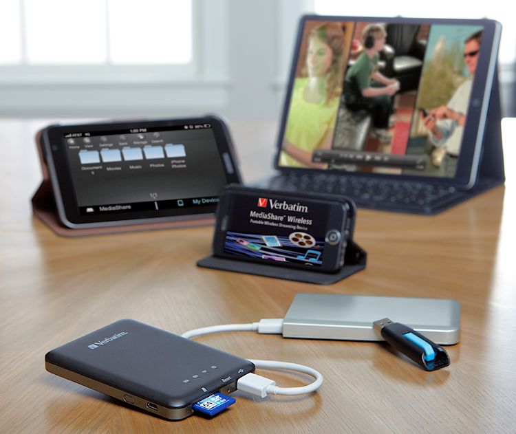 Anstelle eines eingebauten internen Speichers verfügt das Verbatim MediaShare Wireless über einen integrierten SD-Speicherkarten-Slot sowie einen integrierten USB-Anschluss. Dadurch bietet das MediaShare Wireless eine besonders kostengünstige Möglichkeit praktisch unbegrenzte Speicherkapazität zur Verfügung zu stellen, in dem es ein Netzwerk zwischen Tablets und Smartphones herstellt. Zum Vergleich: Für den Herstellerpreis von zusätzlichen 16 GB Speicherkapazität des Top-Tablet-Produkts im Markt lassen sich mindestens sechs 16 GB SD Cards, sechs 16 GB USB-Sticks oder eine 1TB mobile Festplatte erwerben und durch die MediaShare Wireless bequem als Speichererweiterung nutzen.