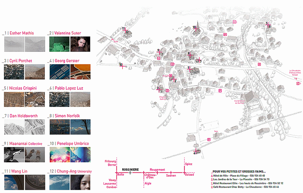 • Maanantai Collective (Finnland), Wettbewerbspreisträger. Die neun Mitglieder des Maanantai Collective absolvieren alle eine künstlerische Ausbildung an der Aalto-Universität in Helsinki. Ziel ihres im Sommer 2012 realisierten Projekts war es, einen neuen Blick auf die norwegische Inselgruppe der Lofoten zu werfen, eine Region, die für ihre malerischen Gebirgslandschaften bekannt ist, die senkrecht ins Meer abfallen. Das oberhalb des Polarkreises gelegene Expeditionsziel bot ihnen die Gelegenheit, gleichzeitig die Begriffe der Höhenlage und der hohen geografischen Breite auszuloten. Ihre allererste Publikation wird zeitgleich mit der diesen Sommer in Rossinière gezeigten Ausstellung erscheinen (Verlag Kehrer).