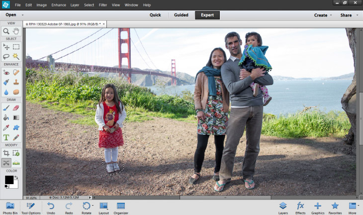 Inhaltssensitives Verschieben: Mithilfe dieser exklusiven Adobe-Technologie können Objekte innerhalb eines Fotos ganz einfach verschoben und daraus entstehende leere Flächen automatisch ausgefüllt werden.