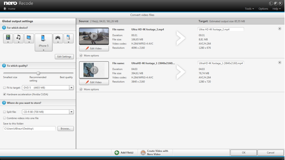 Screen des in der Suite enthaltenen Programms Nero Recode: Ein UHD-/4K-Video kann einfach fürs iPhone konvertiert werden.