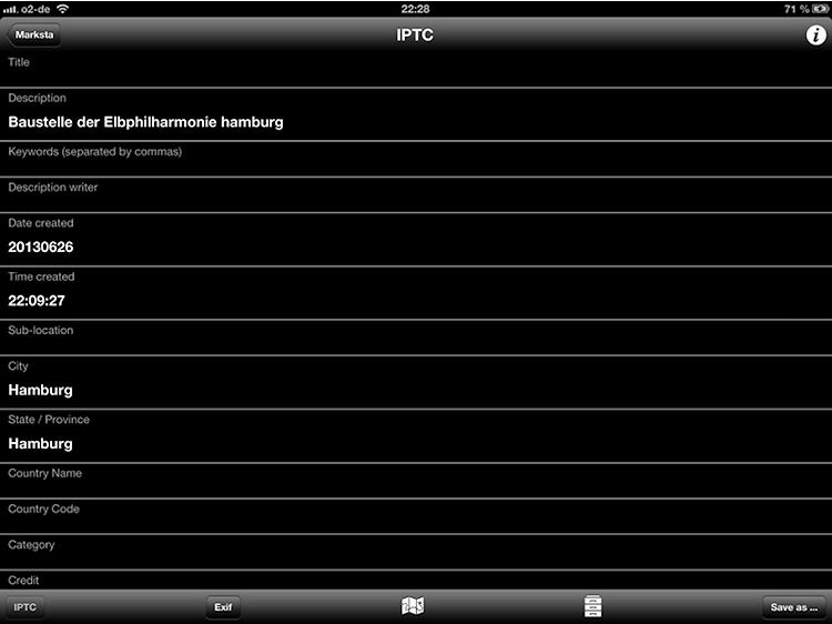 Was definitiv noch fehlt, ist ein Speicher, um einen Schriftzug auf Dauer speichern zu können. Mit dem Wasserzeichen ist das ja kein Problem, das muss ohnehin extern erstellt und dann in den eigenen Fotos auf dem Mobilgerät gespeichert werden. Aber der Schriftzug muss bei jedem Bild neu konfiguriert werden. Nett ist dagegen das Feature, in den IPTC-Daten noch eintragen zu können, wer das Foto wo gemacht hat. Auch eine genaue Position lässt sich so via Karte eingeben.