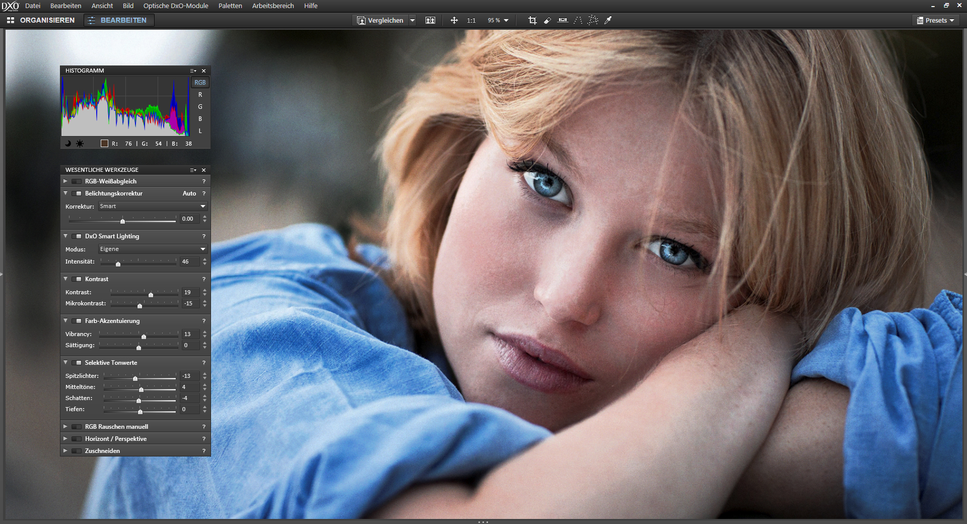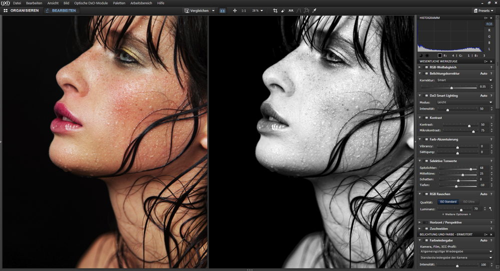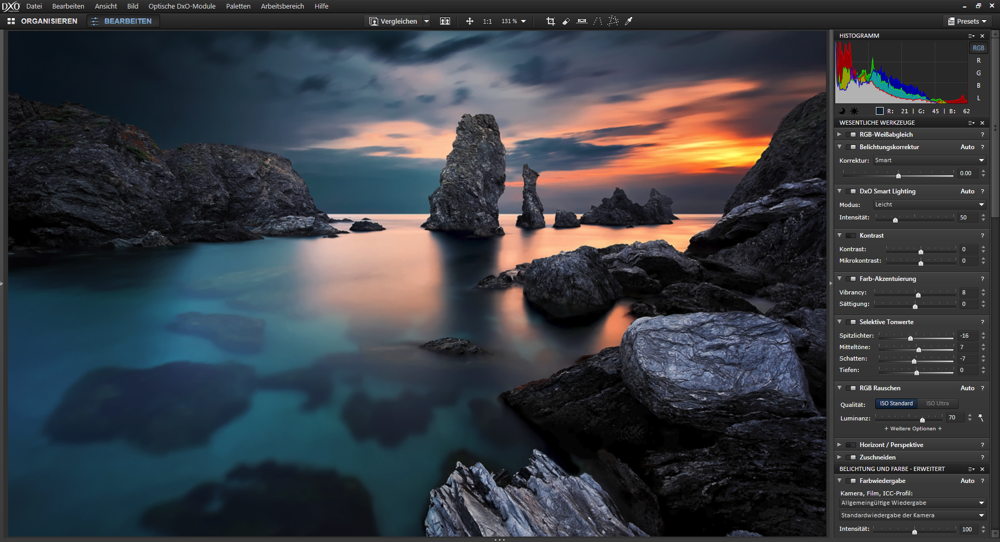 Die Funktion «DxO Smart Lighting» optimiert den Gesamtkontrast des Bildes und passt ihn intelligent an den Inhalt an. Sie bietet eine noch gezieltere Steuerung der Spitzlichter. Bilddetails, die man schon verloren glaubte, werden ans Licht geholt und Farbfehler minimiert. Auch herfür nutzt die Software, die in den Korrekturmodulen gespeicherten Eigenarten eines Kameramodells.