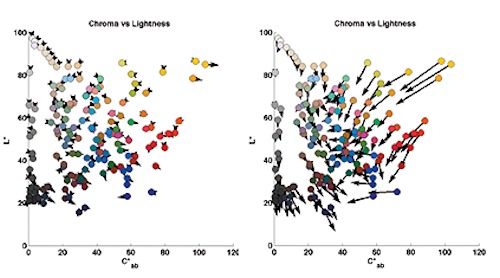 Dieser grafische Vergleich verdeutlicht die hohe Farbgenauigkeit von Sinar CTM (Color To Match, links), gegenüber einer Aufnahme hergestellt mit einem aktuellen, handelsüblichen Digitalrückteil (rechts). Die Pfeildarstellung zeigt das Soll-/Ist-Resultat der entsprechenden Farben. Das Rochester Institute of Technology (RIT), USA, hat Digitalrückteile unterschiedlicher Hersteller mit Sinar CTM verglichen. Messungen mit anderen Digitalrückteilen können unterschiedlich ausfallen, zeigen aber in der Gesamtheit vergleichbare Abweichungen gegenüber den Sollwerten.