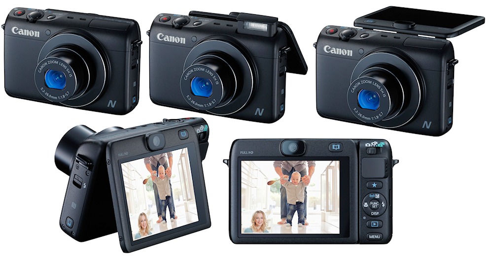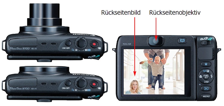 Zwei Kameras in einer: Die Canon PowerShot N100 fotografiert mit der «Hauptkamera» vorn das anvisierte Motiv sowie gleichzeitig mit der gegen hinten gerichteten «Story-Kamera» den Gesichtsausdruck des Fotografierenden. So werden beide Seiten einer Geschichte erzählt und es entstehen Bilder und Movies, mit einem besonderen Bildeffekt.