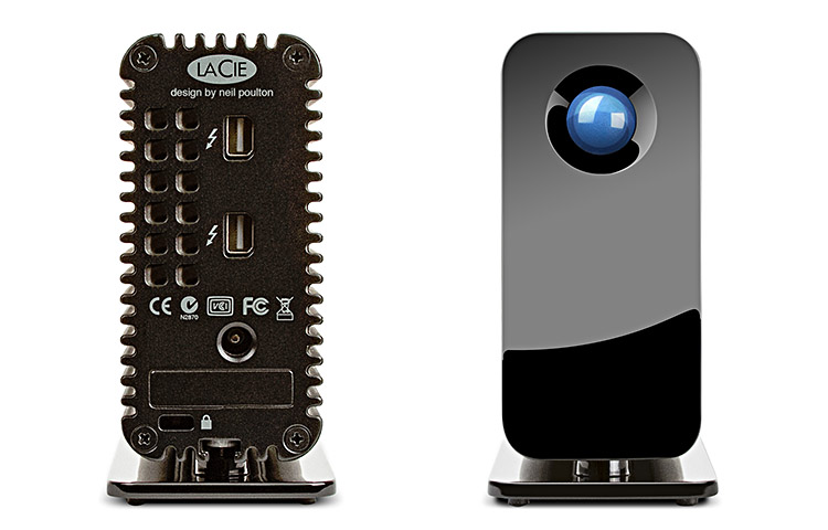 Die Little Big Disk ist so klein (40 x 140 x 85 mm, 620 g ohne Ständer), dass sie in eine Handfläche passt. Ihr Alugehäuse hat ein tiefschwarzes Finish. Das Design stammt von Neil Poulton.