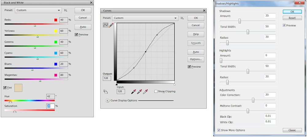 Die neuen Einstellungen der Schwarzweiss-Konvertierung, die Gradationskurve und die Lichter-/Schatten-Kontrolle