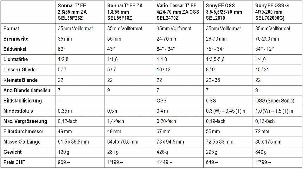 Mit dem lange erwarteten Telezoom 70-200 mm mit durchgehender Lichtstärke 1:4,0, das diese Tage auf den Markt kommt, ist das Objektivquintett zu den a7/a7R Kamera vorläufig komplett, doch sollen bis Ende dieses Jahres nochmals so viele neue Objektive hinzu kommen. Hier ein Überblick über die fünf verfügbaren Vollformat-Objektive: