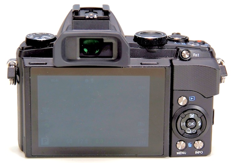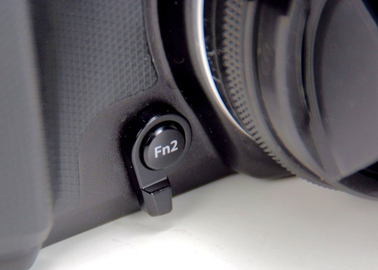 Die an der Vorderseite befindliche Funktionstaste Fn2 dient bei Werksbelegung dazu, durch Tastendruck die Kamerafunktionen durchzublättern und gegebenenfalls zu ändern. Unterhalb der Funktionstaste befindet sich ein kleiner Kipphebel, mit dem die Kamera auf manuelle Fokussierung umgestellt werden kann. Dabei wird zudem die Rasterung des Objektivdrehrings ausgeschaltet, so dass dieser frei in beide Richtungen gedreht werden kann, um die Entfernung manuell einzustellen. Gleichzeitig wird das Bild auf dem Display vergrössert, was eine präzisere Einstellung ermöglicht. Mit diesem Einstellungskomfort – den es auch bei anderen Modellen in ähnlicher Weise gibt – lernt man die manuelle Fokussierung bei statischen Motiven und wenn es wirklich drauf ankommt, zu schätzen. Allerdings kann es auch vorkommen, dass man den kleinen Kipphebel versehentlich betätigt, beispielsweise, wenn man die Kamera in die Tasche steckt, was sich mit der Displayanzeige «MF» und einer seitlichen Entfernungsskala bemerkbar macht.