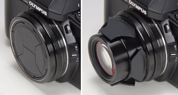 Auffällig und schon fast charakteristisch für die Stylus 1 ist der automatische Objektivdeckel, der sich beim Ausfahren des Objektivs öffnet und beim Ausschalten der Kamera wieder schliesst. Das ist sehr praktisch, schützt das Objektiv vor Verschmutzung und Fingerabdrücken, und man verliert den Objektivdeckel nie mehr. Man kann ihn auch abschrauben, wenn er einem nicht gefällt und beispielsweise an dem grossen Gewinde den optional erhältlichen 1,7x optischen TelekonverterTCON-17X mit Adapter an der Stylus 1 verwenden.
