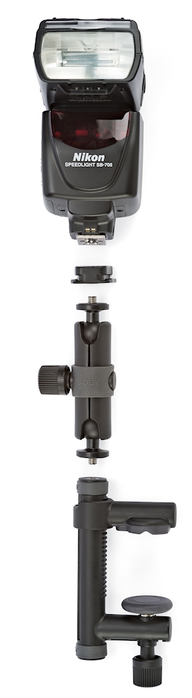 Mit der Flash Clamp & Locking Arm bietet JOBY Fotografen ein Zubehör für nahezu alle Blitzgeräte (z.B. Canon Speedlite 430 EX II Flash, Nikon SB-700 AF Speedlight i-TTL Flash) und LED-Leuchten geeignet ist, um ein Motiv aus den unterschiedlichsten Winkeln und Richtungen auszuleuchten und Effektlichter zu setzen. Dafür wird die Klemme an einem Objekt befestigt und der Blitz über eine universelle Blitzschuh-Wechselplatte auf dem Locking Arm angeschraubt. Die Positionierung des Blitzes in Abhängigkeit von den Lichtverhältnissen, steuert der Fotograf über die beiden integrierten Kugelgelenke des Locking Arms.