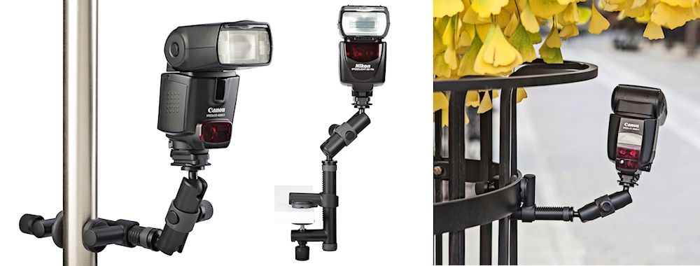 Der «Flash Clamp & Locking Arm» ist eine stabile Klemme, die an jedem Objekt mit einer maximalen Breite von 5 Zentimeter angeschraubt werden kann. Der Blitz oder die LEDs werden über eine universelle Blitzschuh-Wechselplatte am Locking Arm befestigt. Der Locking Arm verfügt über zwei integrierte Kugelgelenke, über das Blitzgerät oder eine LED-Flächenleuchte für eine verbesserte Ausleuchtung bei Fotoaufnahmen in jede beliebige Position gedreht werden kann.