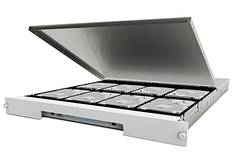 Design in 1U: Beim Kauf von professionellen Rack-Speicherlösungen ist Benutzerfreundlichkeit ein entscheidender Faktor, weshalb bei der Entwicklung der 8big Rack besonders darauf geachtet wurde. Die Speichereinheit hat ein schlankes Aluminiumgehäuse und ist mit vier oder acht Festplatten bestückt, bietet somit bei HDDs mit 6TB bis zu 48 TB Kapazität in 1U , d.h. in einer Höheneinheit für Racks im 19-Zoll-Standardformat.