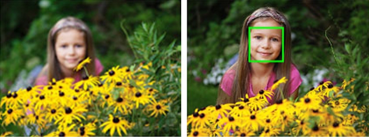 Ohne Gesichtserkennung (links) stellt die Kamera auf die Blumen im Vordergrund scharf, während mit Gesichtserkennung (rechts) die Schärfe auf das Mädchen dahinter gelegt wird. (Foto: Canon)
