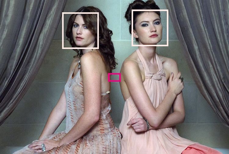 Der zentrale Sensor (rotes Rechteck) würde durch die beiden Models hindurch auf den Hintergrund fokussieren, die Gesichert wären unscharf. Die Gesichtserkennung misst auf die beiden Gesichter, bei manchen Systemen auch auf das rechte oder linke bzw. auf beide Augen.