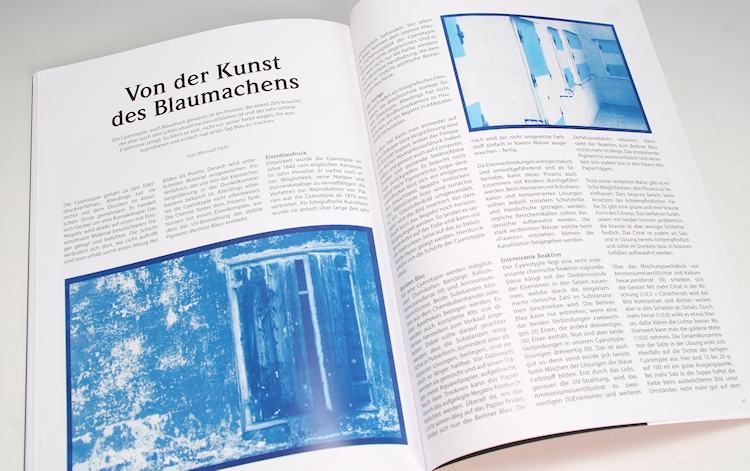 Auch ein Schweizer Autor ist in der jüngsten Ausgabe von PhotoKlassik zu lesen: Manuel Hefti erklärt in seinem Artikel «Von der Kunst des Blaumachens» die Cyanotypie. Der Titel hat einen ironischen Doppelsinn, denn man muss gut und gerne einen Tag Blau machen, um die blauen Bilder in einem befriedigenden Resultat zu erzielen.