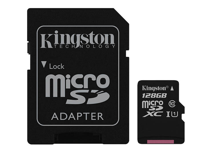 Die UHS-I-microSD-Karten der Klasse 10 gibt es von Kingston ab sofort mit 128 Gigabyte Speicherkapazität. Damit eignet sie sich besonders zum Speichern von Apps, Musik, Fotos und Videos, die viel Platz auf einem Smartphone oder Tablet beanspruchen.Kingston 128GB microSDHC class 10 wAdapter frontalDie microSD-Karten von Kingston gibt es in SDXC-Varianten nun mit Kapazitäten bis 128 GB. Sie ist auch mit microSD-zu-SD-Adapter erhältlich.