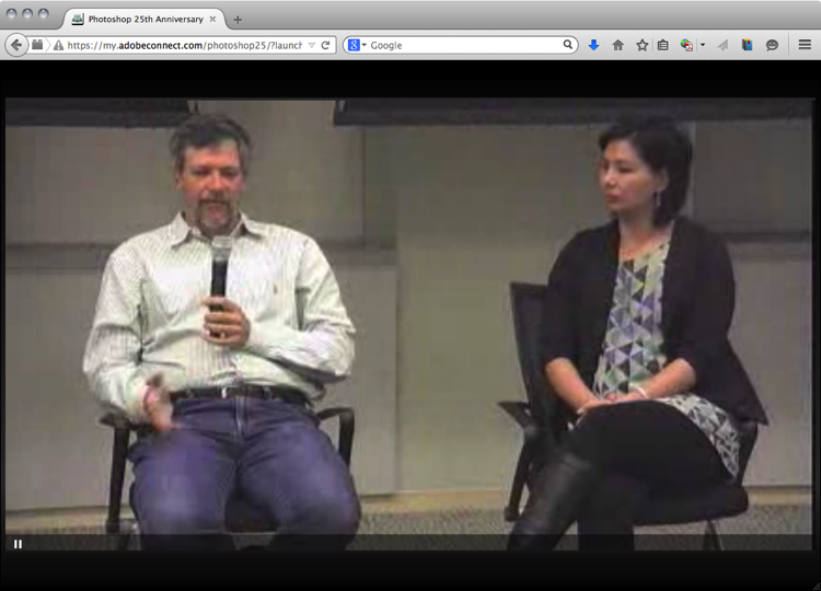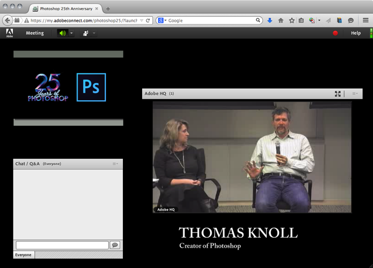 Zum Auftakt des Geburtstages von Photoshop veranstaltete Adobe eine Videokonferenz mit dem Photoshop-Erfinder und aktuellen Photoshop-Verantwortlichen. (Gestreamt wurde die Konferenz per Adobe Connect und konnte gestern – hierzulande war es bereits Abend – live verfolgt werden.)