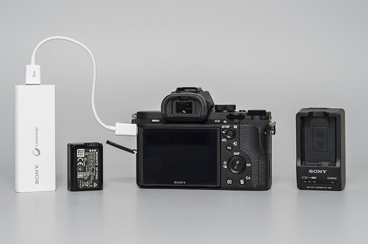 A7M2 mit PowerBank 2015-0311-E02-22 acrDie kleinen Akkus müssen in der Kamera geladen werden. Den Ladestrom erhält sie per USB von einem USB-Netzgerät, einem PC oder zur Not – wie im Bild – von einem PowerTank. Dennoch wäre es wünschenswert, wenn das rechts abgebildete Ladegerät zum Lieferumfang gehören würde.
