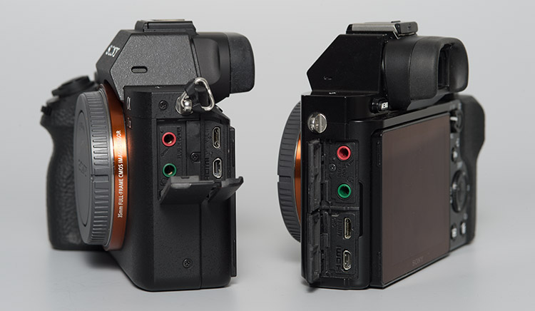 A7M2 vs A7s Ports 2015-0311-E02-17Neu angeordnete Anschlüsse: Links ist das matte Gehäuse der neuen A7M2, deren Anschlüsse von Gummilaschen verdeckt werden. Rechts ist die A7s abgebildet.