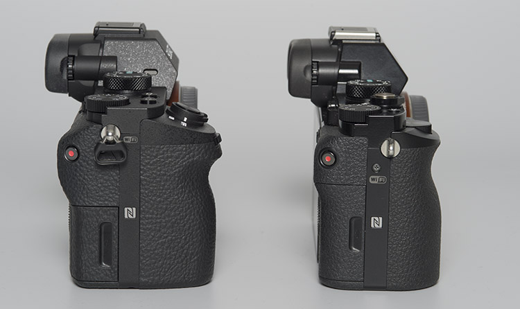 A7M2 (links) vs A7s GriffMehr Grip: Mit der grösseren Griffwulst samt nach vorne verlagertem Auslöser und Einstellrad bietet die neue A7M2 gegenüber den bisherigen A7-Modellen (hier A7s) eine deutlich bessere Ergonomie. Wegen dem grösseren Griff variieren die Abmessungen vor allem in der Tiefe (A7M2: 126,9 x 95,7 x 59,7 mm, A7/A7R/A7s: 126,9 x 94,4 x 48,2 mm).