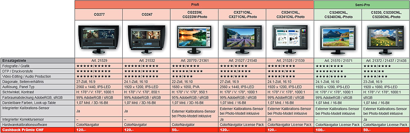 Jetzt belohnt Eizo AG Schweiz den Kauf eines ColoEdge Moitors bis 31. Mai 2015 (mit Option auf Verlängerung) mit einem Cashback von bis zu CHF 120.–. Dies gilt für folgende Modelle: